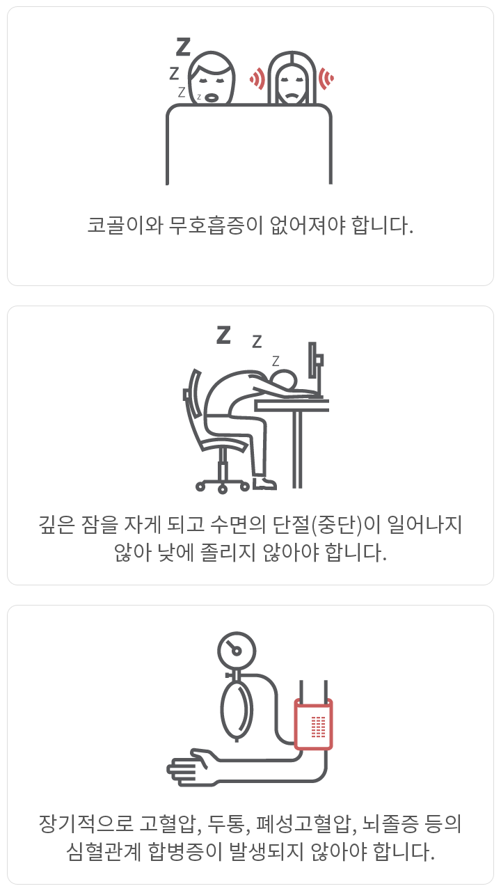 수술적 치료 시 수술적 치료의 목표는 증상의 개선이 아닌 완치에 있다는 점입니다. 따라서 수술적 결과를 지속적 양압술의 결과에 비교할 수 있어야 합니다. 다음의 세 가지가 만족되어야 합니다.