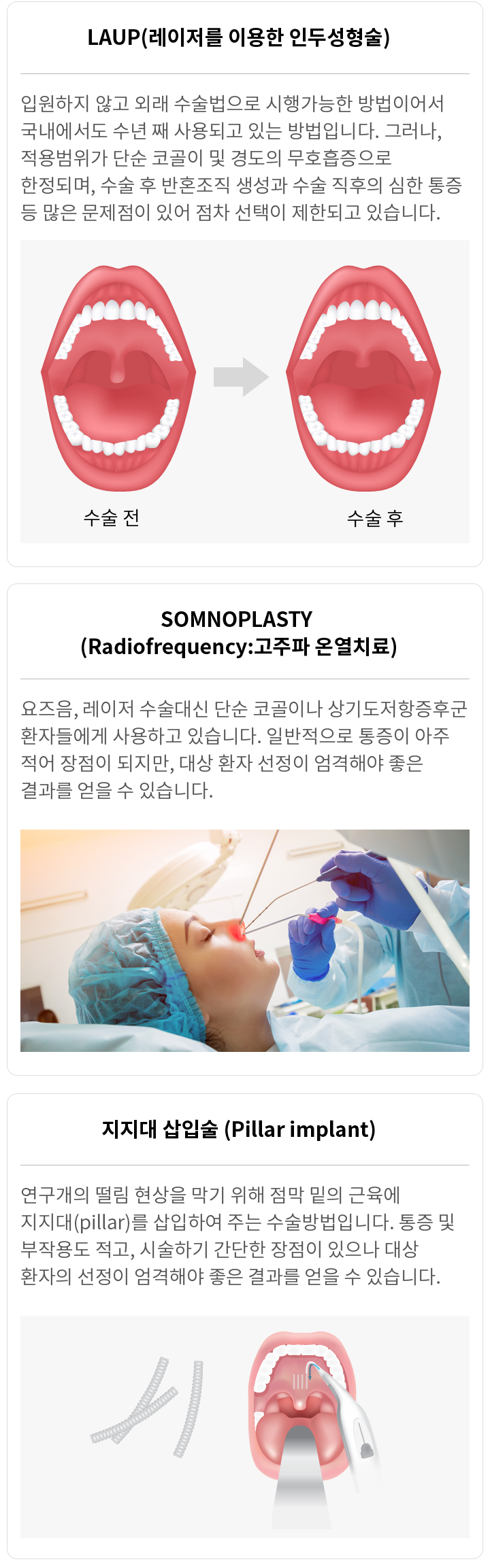 미국수면학회의 실행위원회의 수술적 치료에 대한 3가지 지침을 살펴보면 다음과 같습니다. 중등도나 중증의 수면무호흡증 환자의 치료는 지속적 양압장치가 추천되며, 수술적 치료는 수면무호흡증의 원인이 수술적으로 교정 가능한 이상을 가진 환자에게 적용하며, 또한 수술적치료는 다른 비침윤적(noninvasive)치료에 성공하지 못했거나 거부한 환자에게 수술을 받을 수 있을 정도로 내과적으로 안정되고, 수술적 치료를 원하는 환자에게 적용됩니다.