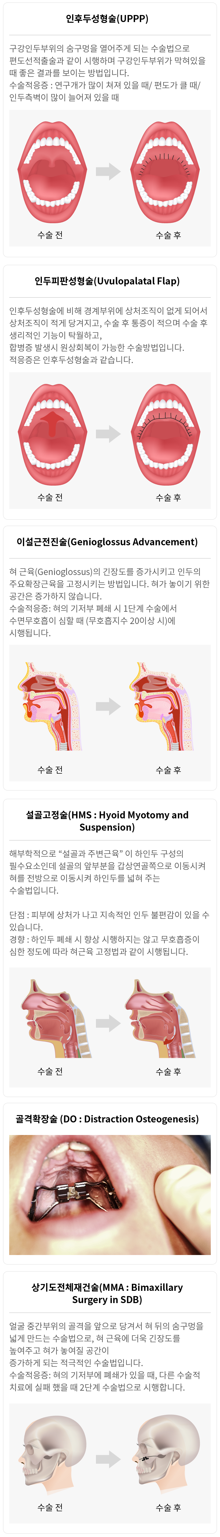 여러 가지 수술 방법 중 환자에게 가장 적절한 수술 방법을 정하는 문제는 여러 가지 검사를 종합하여 결정하게 됩니다. 수술은 처음부터 큰 수술을 하지 않고, 막힌 부위에 대한 직접적인 수술을 먼저 시행하게 되고 (1단계수술), 3~6개월 후 수면 검사를 통하여 성공여부를 판단한 후, 실패 시 숨구멍 전체에 대한 재건수술을 시행하게 됩니다.